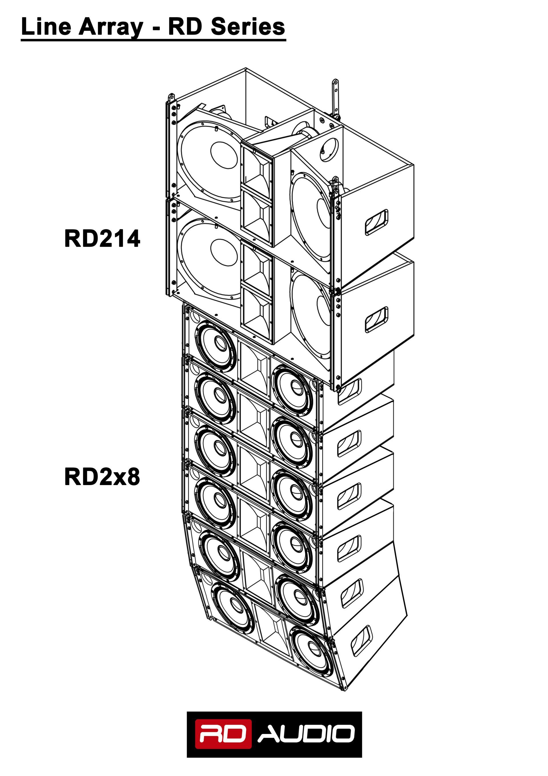 Nuestros recintos Line Array RD2X8 Y RD214, se pueden acoplar entre sí, gracias a su compatibilidad mecánica y acústica. Lo que nos permite realizar variedad de configuraciones con mucha más versatilidad.